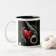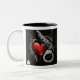 This vintage black-and-white illustration showcases a handcuff and handgun alongside a bleeding red heart, set against a dark background with soft light accents. The gold touches add elegance, capturing the intense themes of love and conflict.