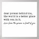 Inspirational & motivational quote saying: dear person behind me the world is a better place with you in it.