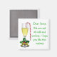 Fun little Christmas magnet, with a note to Santa. A festively decorated wine glass, with gold bow and a sprig of holly, on the stem and a candy cane hanging on the edge, decorates this fun holiday magnet. A cute note to Santa reads, Dear Santa, We are out of milk and cookies, I hope you like this instead. Personalise if you want the text to say something else.