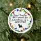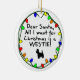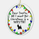 Dear Santa, All I want for Christmas is a Westie! Super cute dog lover ornaments, stamps, stickers and more, perfect for including your favourite pet in the holiday season. A colourful string of Xmas lights circles the outside, while a child's note to Santa and his drawing of the dog breed are in the centre. Very cute West Highland White Terrier design!