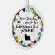 Dear Santa, All I want for Christmas is a Yorkie! Super cute dog lover ornaments, stamps, stickers and more, perfect for including your favourite pet in the holiday season. A colourful string of Xmas lights circles the outside, while a child's note to Santa and his drawing of the dog breed are in the centre. Very cute Yorkshire Terrier design!
