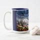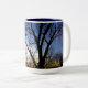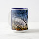 The branches of a tree reach into the blue sky on a crystal clear day- on a mug of blue and golds. A perfect gift for any who love nature. Mug.