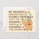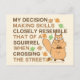 My decision making skills closely resemble that of a squirrel when crossing the street. Funny saying typography with a cute confused squirrel graphic with acorns and oak leaves in brown, orange and green.