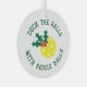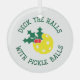 Deck The Halls With Pickle Balls Christmas Funny Ornament features the text "Deck the halls with pickle balls" in modern green typography surrounding a pickle ball with holly. Perfect for Christmas. Evco Holidays www.zazzle.com/store/evcoholidays