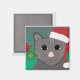 A cute cat decked out for the holidays in a fun Santa hat and decorations hanging from his ear.