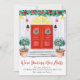 Elegant holiday moving announcements displaying a painted red front door decorated with watercolor Christmas wreaths, winter evergreen garland, Christmas ornaments, and potted boxwood shrubs with holly berries. The phrase "We're Decking New Halls" is displayed in a red, hand-lettered modern script with your new address and name below.