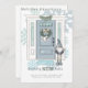 Decking new halls Happy Holiday Christmas card and New Address announcement in one .. A winter themed snowflake design with front door and cute long legged elf with a wreath and ice skating boots - new home address seasons greetings card from Ricaso - add your own greeting, address and a photograph