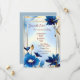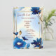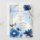 This wedding card design features a luxurious, art deco-inspired style with elegant gold lines framing a soft gradient blue background. The border is adorned with intricate, stylised blue flowers and delicate gold leaves, giving the card a sophisticated and refined appearance. The combination of deep blue hues with gold accents creates a harmonious and visually striking aesthetic, perfect for a formal and elegant wedding invitation. Personalise the text regarding the names and details of the wedding. You can download the card to your mobile device or computer. I designed the card with the help of ai technology.