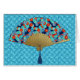 An Art Deco Japanese fan note card in a traditional, stylised chrysanthemum pattern used in Japanese textiles, in shades of blue, turquoise and bright red, outlined in gold, on dark blue, with an embossed gold base and a coordinating deco patterned background