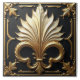 A square relief sculpture on a black background, featuring a central and elegant Art Deco fleur-de-lis design in ivory and gold, surrounded by ornate gold leaf patterns and a gold frame. The fleur-de-lis is stylised with elongated, curved petals, and the gold accents highlight the edges and details of the design. The surrounding frame and leaf patterns are intricately detailed, adding to the overall luxurious and decorative aesthetic of the piece.