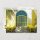 Decorated blue door with yellow benches postcard