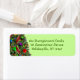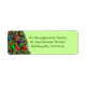 A brightly decorated Christmas tree is shown in partial view to the left of the label; the background colour matches the vibrant green of several of the ornaments. Simply substitute your own name and address (or other message) for the placeholder text that is shown, and you will have created very festive labels for all your holiday correspondence.