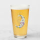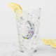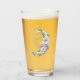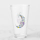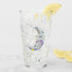 This glass tumbler for beverages has a white crescent moon decorated with colourful abstract shapes including circles, triangles, and scroll in blue, yellow, and purple with a face with blue eyes on the front and back.