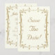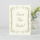 Beautiful and elegant antique gold save the date wedding card template design featuring decorative leafy scrolls around the border. The design has an ivory coloured background for an elegant vintage look. This design also comes on many other paper products and also postage to suit all your wedding set needs.