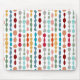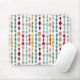 This mouse pad has a mid-century modern design of circles and ovals strung together in retro colours strung together on a field of white.