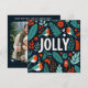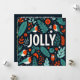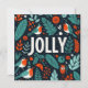 Minimalist holiday card design with a Scandinavian-inspired theme. The card features a simple green and red colour palette, with intricate, stylised illustrations of holly berries and abstract plants, arranged in a harmonious and balanced layout around a central text box. The central box has a clean, modern font with the message "Jolly" The design evokes a natural, festive feel with elegant, hand-drawn details, capturing a modern yet timeless aesthetic.