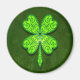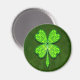 This green four leaf clover design is decorated with sharp lines and flowing swirls. The symmetrical pattern has two leaves on either side with a large stem at the base. This stunning symbol for good luck makes a beautiful magnet design.