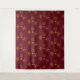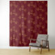 A tapestry with a repeating pattern of fancy golden snowflakes with elegant crystalline shapes. A dark red background.