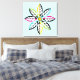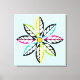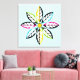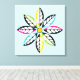 Decorative Leaves-Flower modern, abstract wrapped canvas print design, featuring a flower its petals made of colourful leaves with yellow centre on pale blue background. Two of them in black, yellow, two in black, aqua/turquoise, two in black, fuchsia pink and two in black, lime green. In each of them there are smaller white leaves. This abstract nature inspired square print has a retro feel to it and is completely customisable.