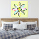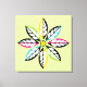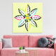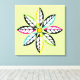 Decorative Leaves-Flower modern, abstract wrapped canvas print design, featuring a flower its petals made of colourful leaves with yellow centre on pale green background. Two of them in black, yellow, two in black, aqua/turquoise, two in black, fuchsia pink and two in black, lime green. In each of them there are smaller white leaves. This abstract nature inspired square print has a retro feel to it and is completely customisable.