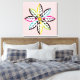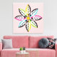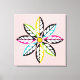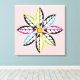 Decorative Leaves-Flower modern, abstract wrapped canvas print design, featuring a flower its petals made of colourful leaves with yellow centre on soft pink background. Two of them in black, yellow, two in black, aqua/turquoise, two in black, fuchsia pink and two in black, lime green. In each of them there are smaller white leaves. This abstract nature inspired square print has a retro feel to it and is completely customisable.