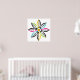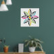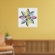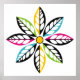 Decorative Leaves-Flower modern, abstract poster design, featuring a flower its petals made of colourful leaves with yellow centre. Two of them in black, yellow, two in black, aqua/turquoise, two in black, fuchsia pink and two in black, lime green. In each of them there are smaller white leaves. This abstract nature inspired square poster has a retro feel to it and is completely customisable and the white background can be changed. Primitive, folk art style.