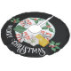 Traditional Christmas Tree Skirt featuring a black border with Merry Christmas in a decorative font in white. Also adorned with wrapped packages art and holly springs with red berries.