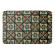 Decorative mosaic squares, simple shapes. Symmetry and repetition. black, amber and blue geometric tile in an ornate pattern.