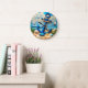 Nautical-themed wall clock with vibrant beach scenery, featuring an anchor, seashells, and sailing boats, accentuating marine aesthetics in home decor. Ideal for adding seaside vibes to interiors.