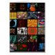 colourful collage with hearts, flowers, ogres, creatures, metallic decorative images, discs, woven patterns, circles, balls, psychedelic pictures, squares, in a modern graphic art images tile pattern with black, red, orange, white, brown, green, purple, blue, yellow and pink, in a multicolored multicoloured and interesting mixture of modern computer assited graphics pictures