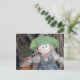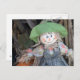 This close-up of a mini decorative scarecrow wearing blue overalls and a green hat while sitting atop a pumpkin covers the front of a horizontal full-bleed photo postcard. This adorable scarecrow image works well for a general fall/autumn theme as well as for Halloween and Thanksgiving specifically. This postcard can easily be customised to add text or change the background colour. An alternative vertical photo postcard of this image is also available in my store.