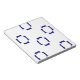 Decorative blue shapes on white pattern.