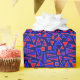 An original design made up mostly of colour decorated shapes, mostly triangles, but also with some rectangles and circles in red and blue edged with white.