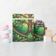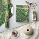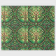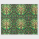 Decorative wrapping paper with a repeating Tree of Life pattern in green tones featuring intricate branches and red fruit within circular motifs.