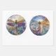 The image features two circular designs with vibrant and intricate dragonflies. The left design displays a pastel colour scheme with shades of yellow, blue, and purple, while the right design showcases vibrant hues of blue, purple, and orange. Both designs are surrounded by flowers and foliage, creating an enchanting and dynamic scene.