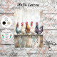 The featured artwork showcases five expressive chickens perched on a weathered wooden fence, each with distinct plumage — from blue-gray and white to reddish-brown and black with purple hues. Set against a whitewashed barnwood backdrop, the design blends country whimsy with artistic texture, ideal for farmhouse, spring, or animal-themed creations.