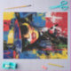 The image is an abstract deco art piece featuring a woman. The artwork is chraacterised by bold, vibrant colours, including blue, yellow, red, and black. The woman is depicted wearing a hat and has long hair. The style is a mix of abstract and deco, with a combination of sharp lines and splashes of colour that create a dynamic and visually striking composition. The use of contrasting colours and the abstract representation make the image interesting and engaging, evoking a sense of modern artistic expression.