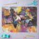 The image is a vibrant and colourful abstract painting of a lady dressed in a striking, fashionable outfit. She is wearing a large, chequered coat with a high collar and a wide-brimmed hat adorned with various patterns and colours. The background is a mix of bright hues, including orange, yellow, purple, and blue, with abstract shapes and textures. The lady's face is blurred out, making it difficult to identify any specific features. The overall style of the painting is modern and expressive, with a focus on bold colours and dynamic patterns. This image is interesting due to its unique use of colour and abstract elements, which create a visually engaging and captivating piece of art.