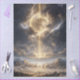 This dramatic decoupage paper features a glowing golden Bitcoin suspended in a stormy sky, surrounded by swirling clouds and crackling lightning. A radiant beam of light pierces the heavens, connecting the coin to a luminous valley nestled between snow-capped mountains. With its surreal energy and mythic symbolism, this design evokes themes of innovation, disruption, and digital destiny—ideal for tech, fantasy, and visionary art projects.