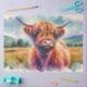 This vibrant decoupage paper features a stylized Highland cow standing in a grassy field, its shaggy fur rendered in bold strokes of orange, red, and purple. With curved horns and a soulful gaze, the cow is framed by rolling hills and a whimsical watercolor sky splashed with pink, blue, and violet. The expressive brushwork and rich palette make this design a standout for farmhouse, animal-themed, and artistic creations.