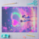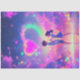The image features an enchanting, animated scene of loving couple standing in shallow water, holding hands and gazing at each other. The background is a vibrant, colourful sky filled with clouds, stars, and heart-shaped lights. A large, glowing heart is prominently featured in the sky above the characters, with a trail of light connecting it to the scene below. The overall atmosphere is dreamy and romantic, with a mix of purples, pinks, blues, and greens creating a magical ambiance. This visually striking and emotionally evocative image captures a tender moment between the two characters, making it perfect for themes of love and romance.