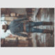 The image depicts the back view of a person dressed in a cowboy outfit. The person is wearing a brown cowboy hat, a blue denim shirt with visible wear and tear, blue jeans, and brown leather boots that appear muddy. The person has a leather belt with a holster on each side, each holding a revolver. The setting appears to be an old western town with a muddy street.