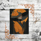 Elegant fall Halloween lady, autumn fashion illustration, orange flower hat design, stylish seasonal outfit, black gloves and neckline, glowing orange moon backdrop, vertical line art accent, whimsical fall decor, sophisticated Halloween theme, rustic autumn elegance
