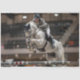 This captivating image captures a white horse and its rider mid-jump over a red and white striped barrier during an equestrian show jumping event. The horse, adorned with protective leg wraps and a bridle, showcases its athletic prowess and grace. The rider, dressed in competition attire including a helmet, jacket, and riding boots, demonstrates skill and precision. The blurred background with a bokeh effect from lights emphasises the action and focus on the horse and rider. “Soaring Elegance” beautifully highlights the partnership and athleticism of both horse and rider in the thrilling sport of show jumping.