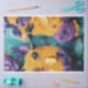 This close-up textured painting features two birds, possibly owls, facing each other. The birds are depicted with thick, swirling strokes of vibrant yellow and purple paint, creating an impressionistic feel. Their eyes are detailed and realistic, contrasting with the abstract rendering of their feathers. The background showcases shades of teal and blue, complementing the yellow and purple tones. This dynamic use of colour and texture makes the artwork captivating and unique.