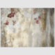 The image showcases a tranquil and picturesque landscape with a dreamy, ethereal quality. The background features a cloudy sky with a soft, golden hue, suggesting a sunset or sunrise. Delicate branches with sparse leaves extend from the top corners of the image, adding to the serene atmosphere. Three butterflies with intricate red and brown patterns are flying in the upper right portion of the image. The ground is adorned with grass and flowers, featuring clusters of vibrant red and white blossoms. This whimsical and charming image is perfect for use in artistic or decorative contexts, capturing the beauty and tranquillity of nature.