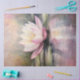 The image depicts a beautifully painted lotus flower in full bloom, floating on a serene water surface. The lotus has delicate petals with shades of white and pink, and the reflection of the flower is visible in the water below. The background is a soft blend of pastel colours, creating a tranquil and ethereal atmosphere. The painting captures the elegance and purity of the lotus, making it a visually captivating and calming piece of art. Lotus flower painting lotus flower, matching paper for budda, full bloom, serene water surface, white and pink petals, reflection, pastel background, tranquil and ethereal atmosphere, elegant and pure, captivating and calming art