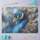 A close-up digital rendering features a peacock amidst an abstract background. The peacock is depicted from just above the mid-body upward, angled from the left, with its body facing towards the right. The bird has an intense direct gaze, and its feathers are rendered in shades of blue and green on its head, transitioning to a deep blue along its neck and body. The peacock's tail feathers include the characteristic “eye” patterns, each with a vibrant blue centre, encircled by golden rings. These feathers are interspersed with golden floral elements, contributing a baroque aesthetic. The background is a swirl of blue and beige hues, dotted with what appear to be small points of light, mimicking a starlit sky. This blends with the peacock's feathers, creating a seamless and dreamy composition. peacock amidst an abstract background.