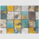 This distressed tile-patterned decoupage background features a grid of square tiles in shades of turquoise, yellow, white, and brown, each with a weathered and rustic texture. The cracked, chipped, and worn surfaces give the design a vintage, antique appeal, making it ideal for creative projects, shabby-chic decor, and mixed-media crafts.