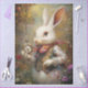 The image depicts a white rabbit dressed in an elaborate, Victorian-style outfit, holding a pocket watch. The rabbit is wearing a floral-patterned shirt with lace cuffs, a colorful scarf, and a vest adorned with intricate designs and buttons. The background is a whimsical, enchanted forest with various flowers and foliage, creating a magical atmosphere. The rabbit's large, expressive eyes and upright ears add to the charm and fantasy element of the scene. This image evokes the character of the White Rabbit from "Alice's Adventures in Wonderland," a classic literary work known for its imaginative and surreal elements.